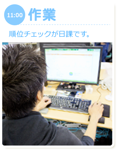部署間でストレス無く連携が取れる。 ウェブの仕事には各部署間での連携なしには価値の高いものを創る事はできません。SEOチームにはプログラムが好きな人やデザインが得意な人がおり、部署を超えて質問や相談のしやすい環境なので、得意な分野があればより伸ばす事ができ、苦手な事にも挑戦できる環境が整っています。私はデザインソフトを触った事もなければ、HTMLのイロハすら知らなかったのですが周囲のサポートもあり、今も毎日の様に新しい事にチャレンジさせて頂いてます!